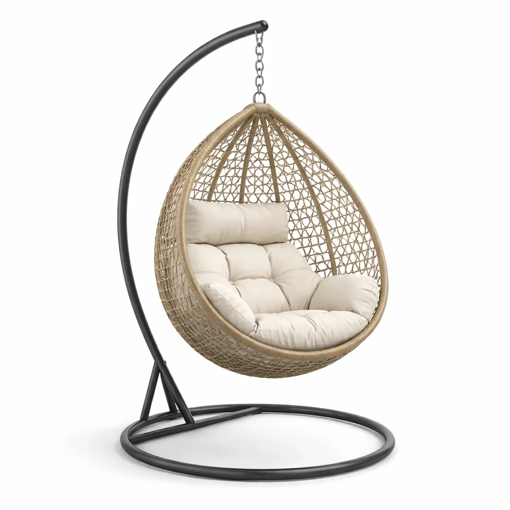 Fauteuil œuf suspendu en Résine Tressée Beige avec Coussin Crème et Structure en Acier